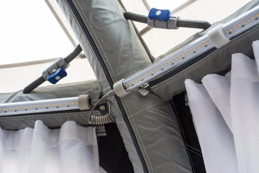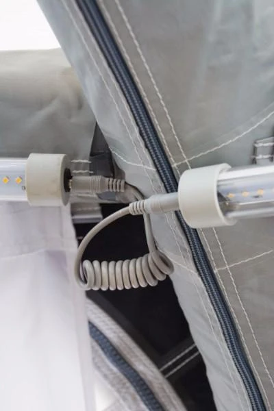 An exciting new accessory for your tent, the SabreLinkâ„¢ lighting system ensures you’re never in the dark. The system allows you to link up to three lights together – that’s 450 LED’s. Each of our AiFrame awnings is SabreLinkâ„¢ ready and can accept lights on the front AirPoles and also the centre poles. An Ace AIR Pro 400, for example, could have three lights along the front and another three in the centre.